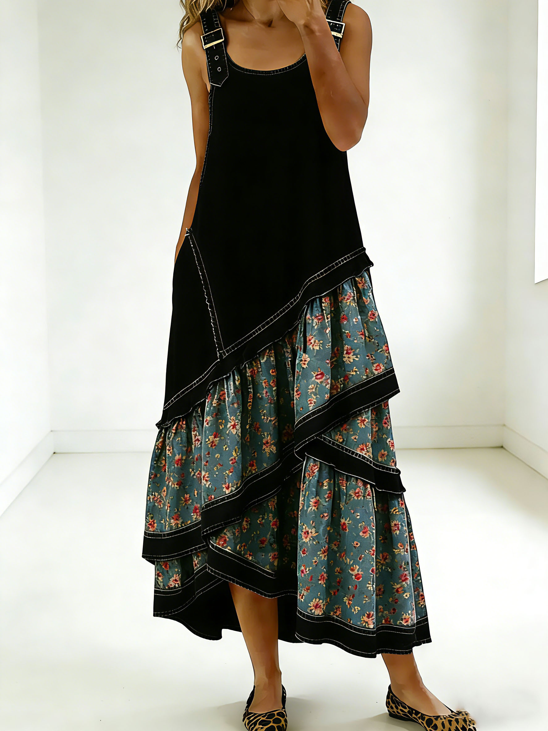 Women's Fashion Floral Denim Design Sleeveless Multi-layered Ruffled Strap Dress